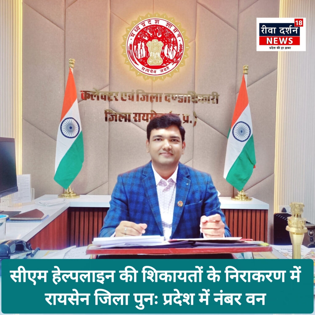 राज्य स्तर से सीएम हेल्पलाइन शिकायतों के निराकरण में माह दिसंबर 2025 की ग्रेडिंग गत दिवस जारी की गई, जिसमें रायसेन जिले ने 89.87 प्रतिशत वेटेज स्कोर के साथ पुनः प्रदेश में प्रथम स्थान प्राप्त किया है। कलेक्टर अरूण कुमार विश्वकर्मा के निर्देशन में जिले में सीएम हेल्पलाईन शिकायतों का अंतिम और संतुष्टिपूर्ण निराकरण सुनिश्चित किया जा रहा है तथा विगत 12 माह से रायसेन जिला निरंतर सीएम हेल्पलाईन शिकायतों के निराकरण में अग्रणी बना हुआ है।