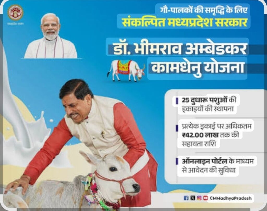 शासन द्वारा दूध उत्पादन को बढ़ावा देने के लिए कई योजनाओं को लागू किया गया है। पशु चिकित्सा सेवायें विभाग द्वारा डॉ भीमराव अम्बेडकर कामधेनु योजना लागू की गई है। इस योजना के माध्यम से मध्यप्रदेश के मूल निवासी सभी वर्ग के पशुपालकों को उन्नत डेयरी स्थापित करने का अवसर दिया जा रहा है।इस संबंध में संयुक्त संचालक पशुपालन डॉ डीएस बघेल ने बताया कि डेयरी स्थापित करने के लिए हितग्राही के पास कम से कम 3.5 एकड़ स्वयं की भूमि होना आवश्यक है। एक हितग्राही अधिकतम आठ इकाईयाँ इस योजना से स्थापित कर सकता है। एक इकाई में गौवंशीय अथवा भैंस वंशीय 25 दुधारू पशु दिए जाते हैं। एक इकाई में सभी पशुओं का एक ही नस्ल का होना आवश्यक है। योजना का लाभ लेने के लिए पशुपालन विभाग की वेबसाइट डब्ल्यूडब्ल्यूडब्ल्यू डॉट एमपी डीएएच डॉट जीओभी डॉट इन पर ऑनलाइन आवेदन करना होगा।